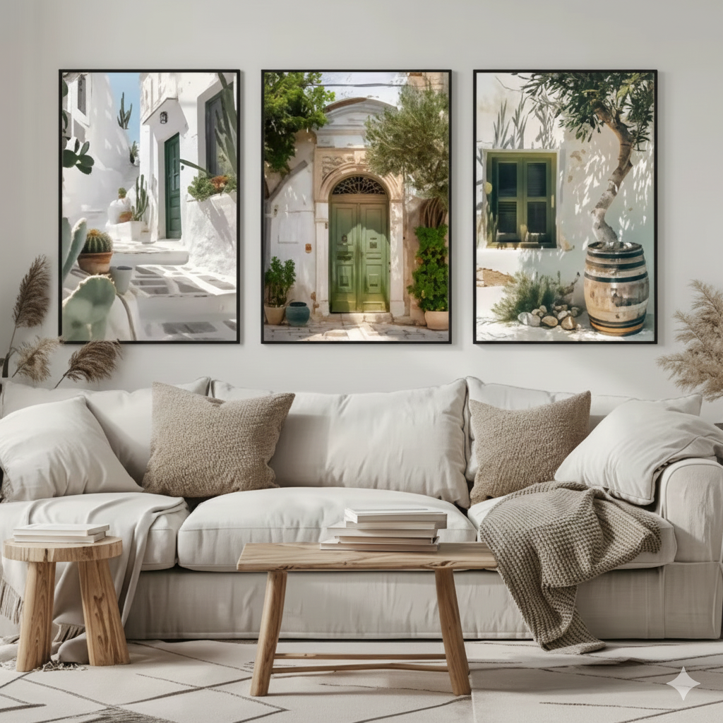 Bring the sun-drenched charm of the Mediterranean into your home with this exquisite three-piece art collection. Each panel captures a unique glimpse of coastal life—from the iconic whitewashed stairways and rustic olive barrels to the charming, weathered doorways of a quiet village.