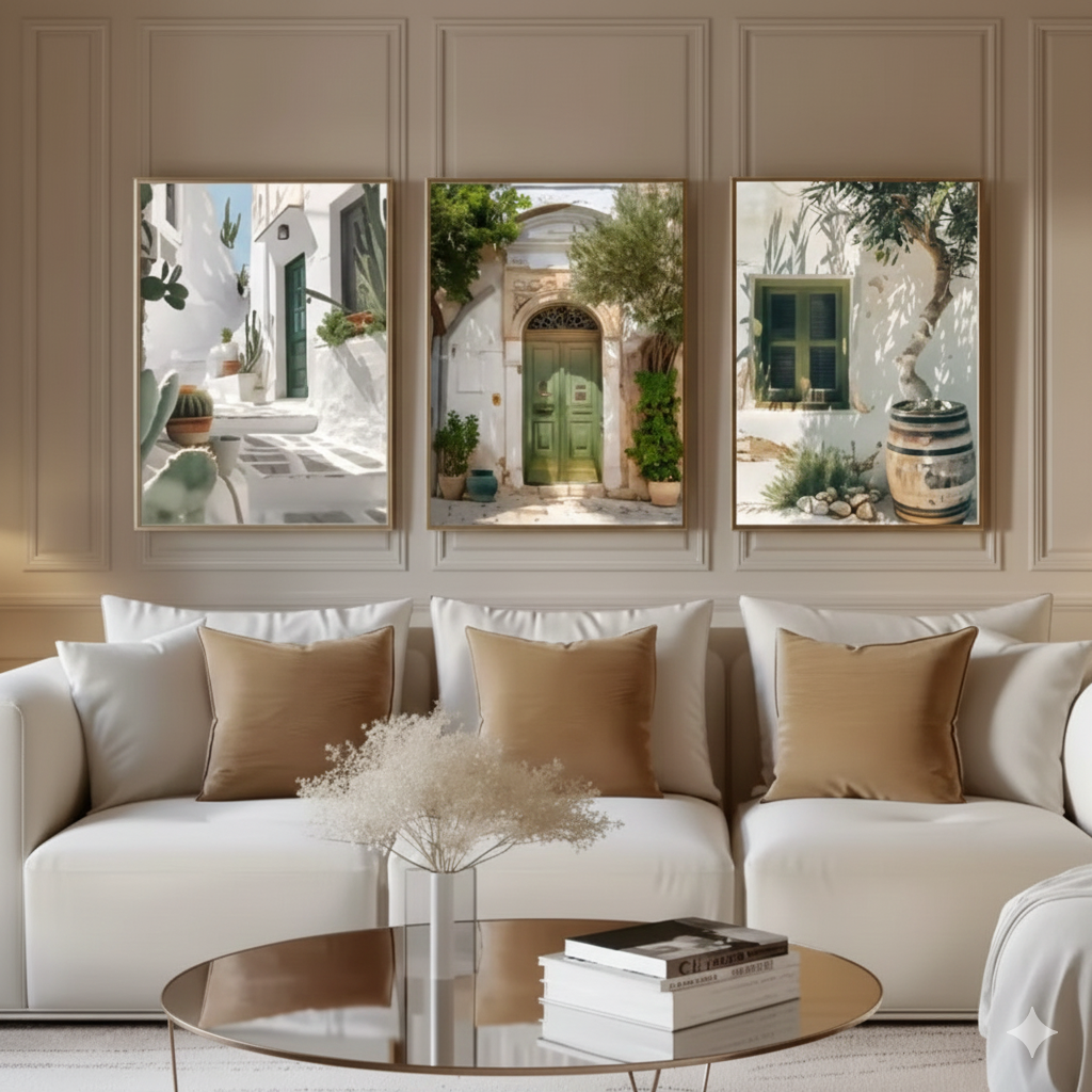 The soft palette of earthy greens, crisp whites, and warm terracotta creates a calming atmosphere, making it a perfect centerpiece for your living room, bedroom, or entryway. Whether you're looking to evoke memories of past travels or simply want to add a touch of timeless European elegance to your decor, this set offers a window into a world of peace and heritage.