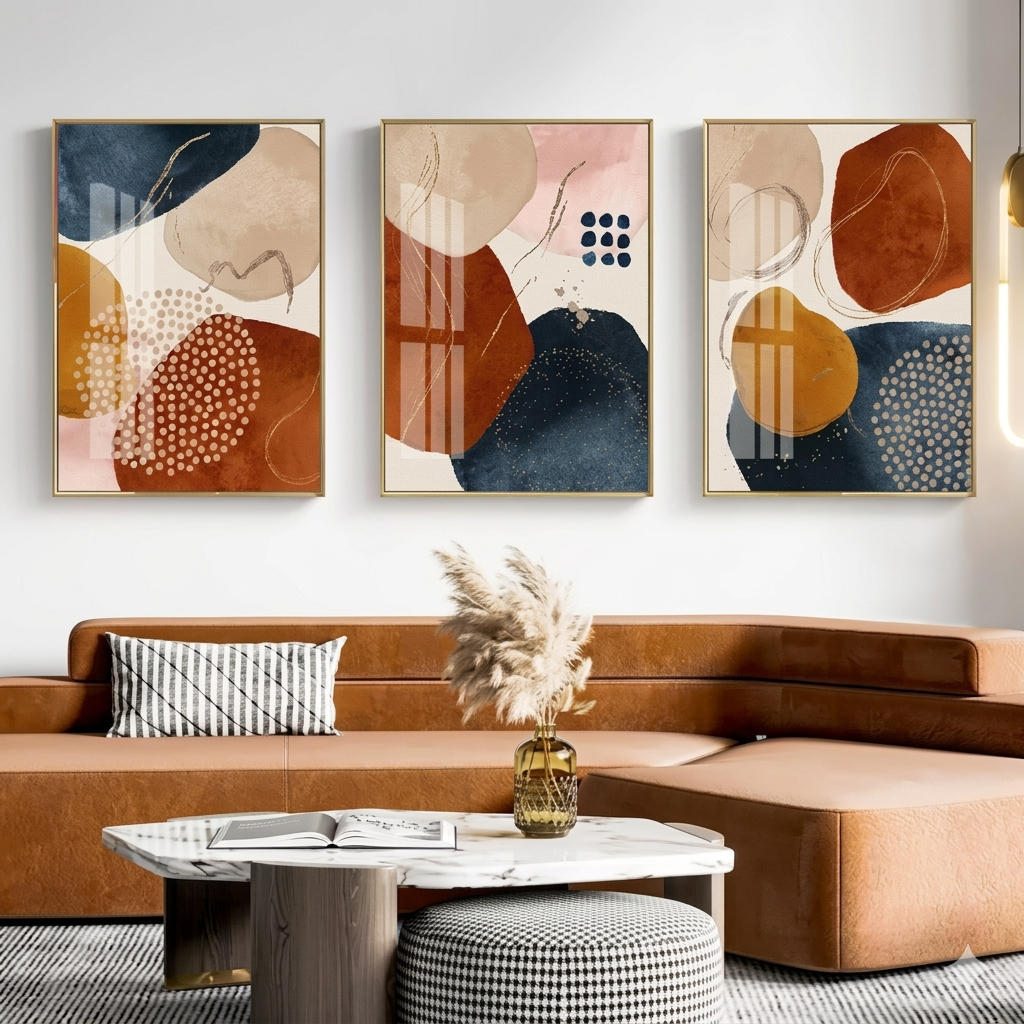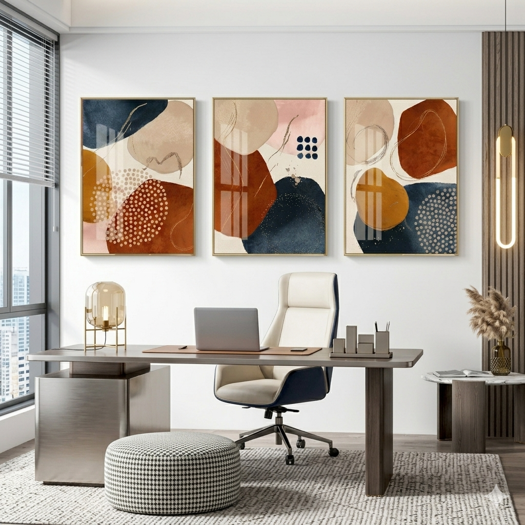Elevate your sanctuary with professional-grade interior design. The Terra & Tide Collection is a curated triptych that strikes a perfect balance between grounded earthy ochres and deep, fluid indigo tones. Featuring organic shapes, metallic-inspired linework, and intricate pointillism textures, these pieces are designed to bring a sophisticated, modern energy to your living space, bedroom, or executive office.
