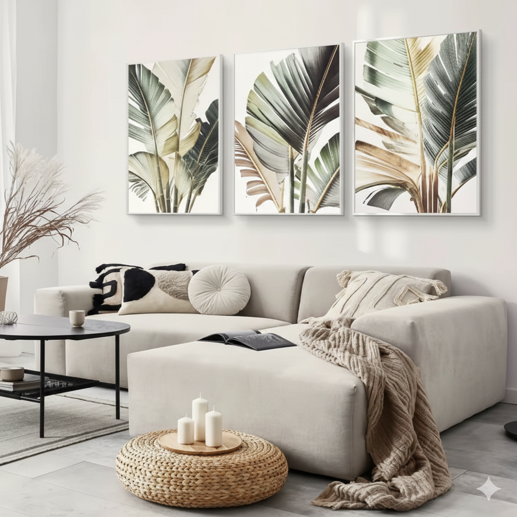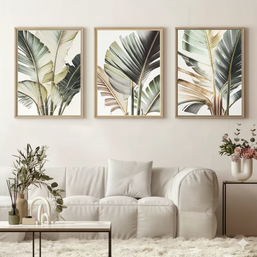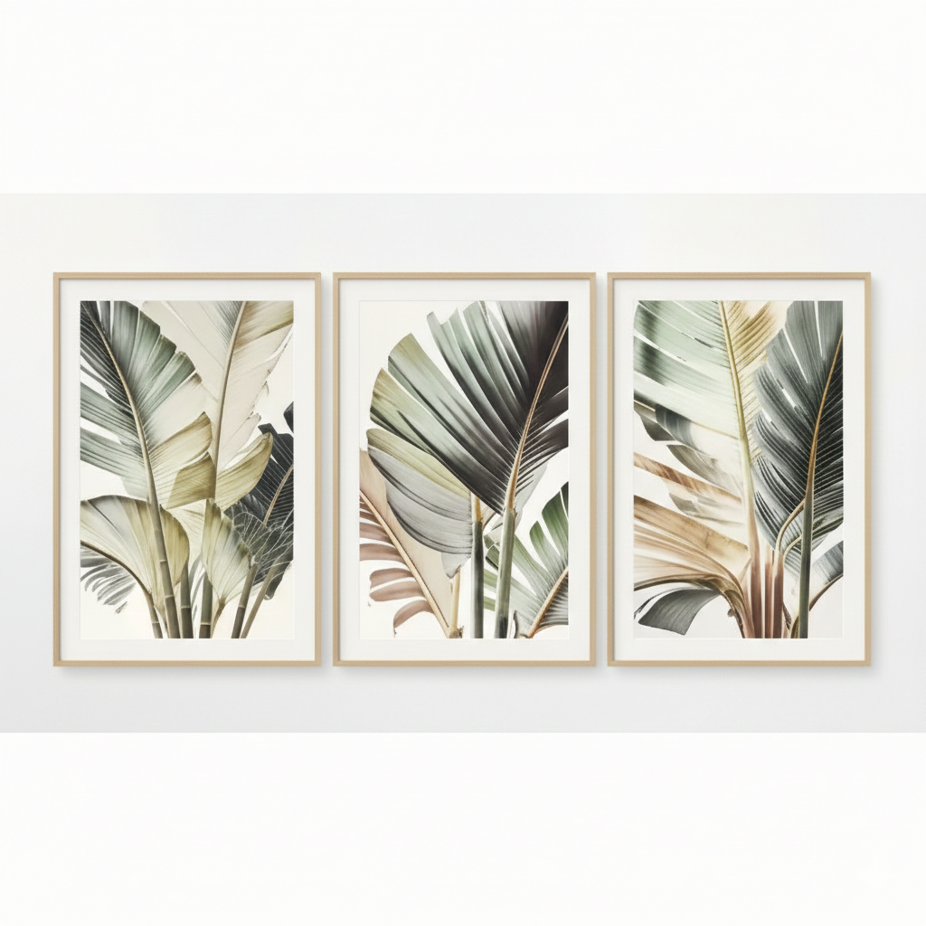 Transform your bedroom into a serene sanctuary with our "Verdant Palms" 3 piece Wall Art Canvas Print collection. This stunning three-piece triptych features oversized tropical leaves in a sophisticated palette of sage green, muted gold, and deep charcoal. Available in 40x60 dimensions, you can choose between a minimalist unframed canvas for a contemporary look or a professionally framed finish to add immediate elegance to your space.